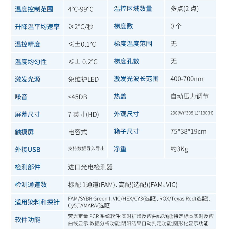 适用染料和探针:FAM/SYBR Green I, VIC/HEX/CY3(选配), ROX/Texas Red(选配), Cy5,TAMARA(选配)